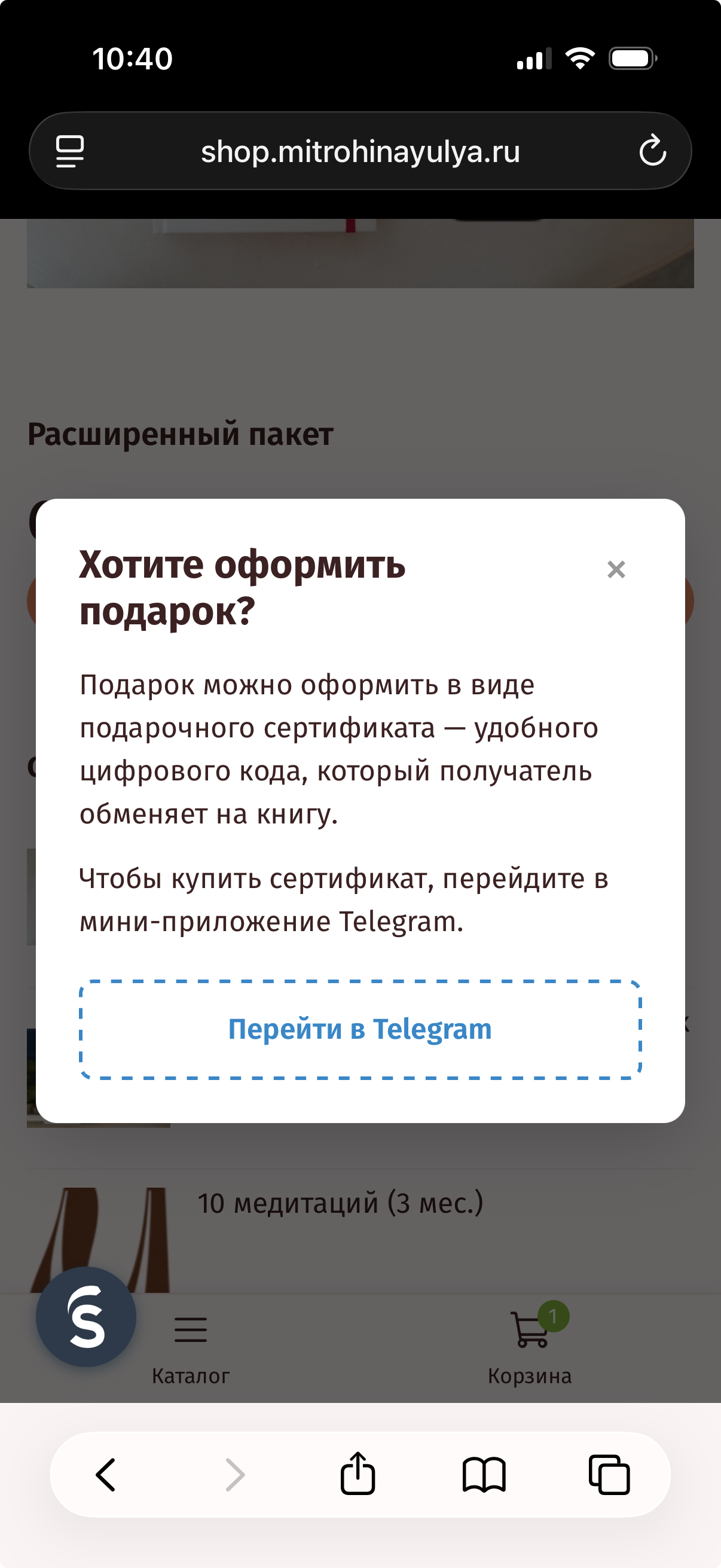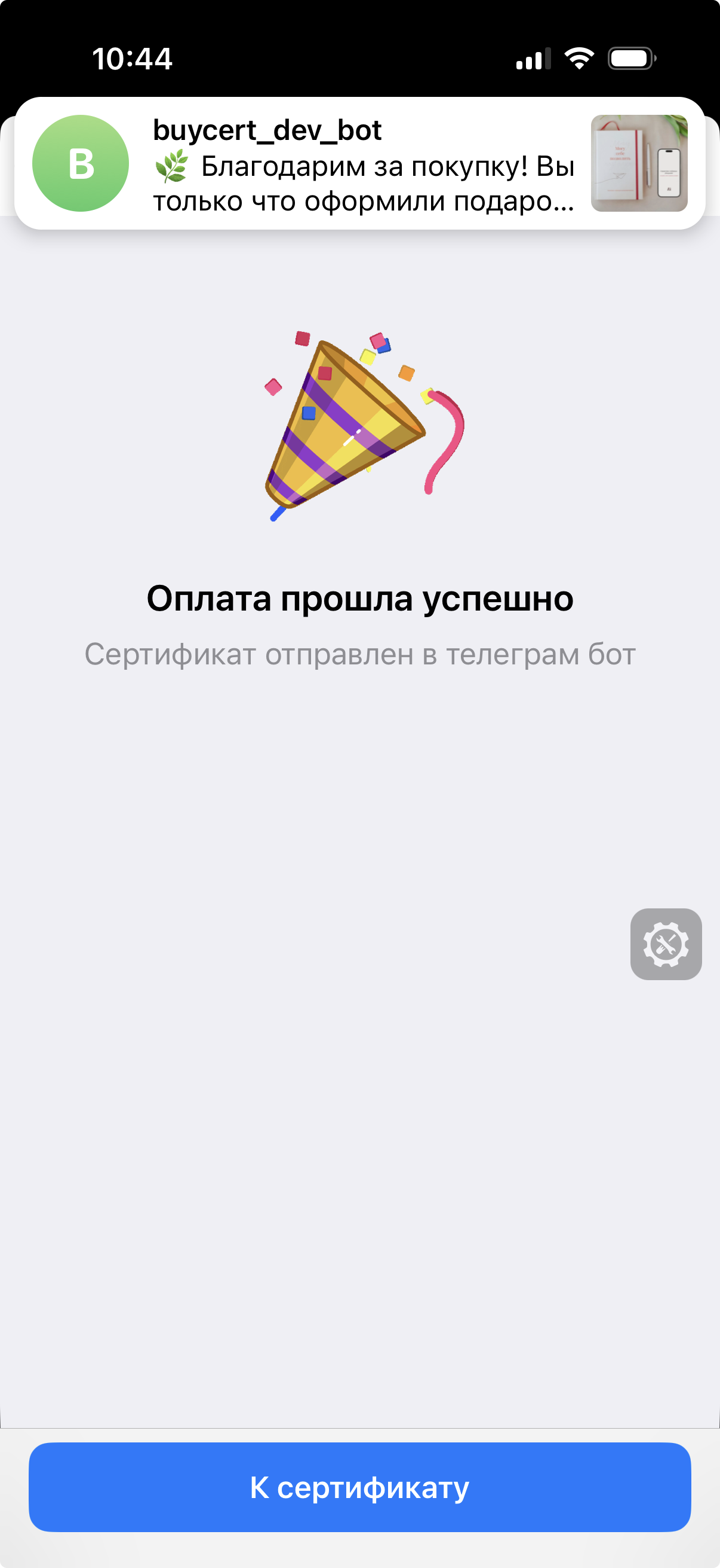 После успешной оплаты появится экран с подтверждением, а в Telegram-боте автоматически придёт сообщение с вашим подарочным сертификатом.